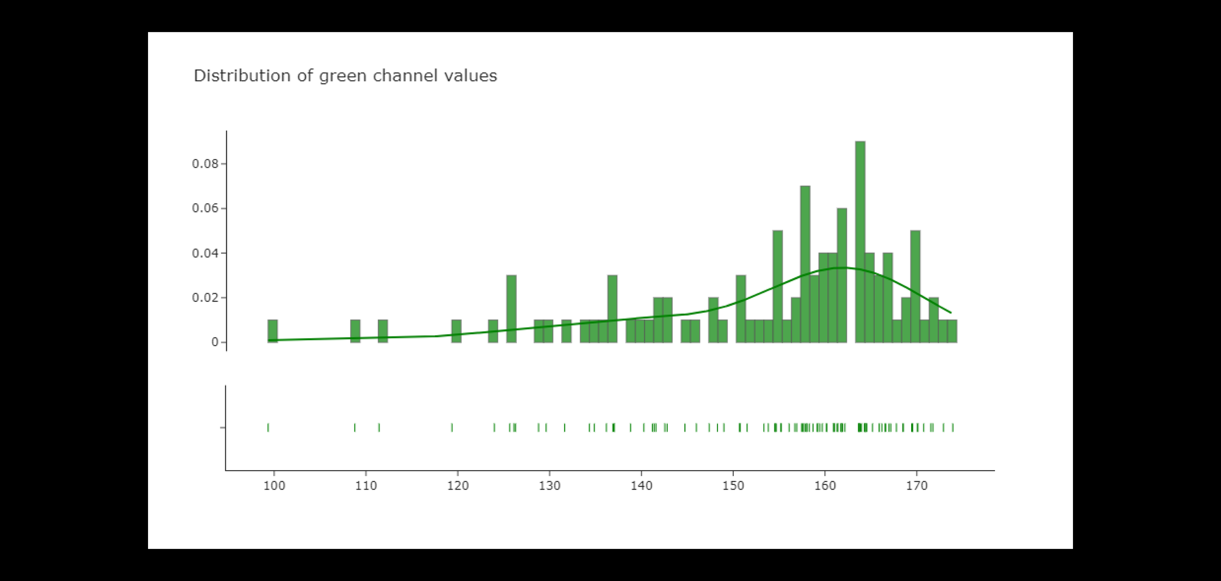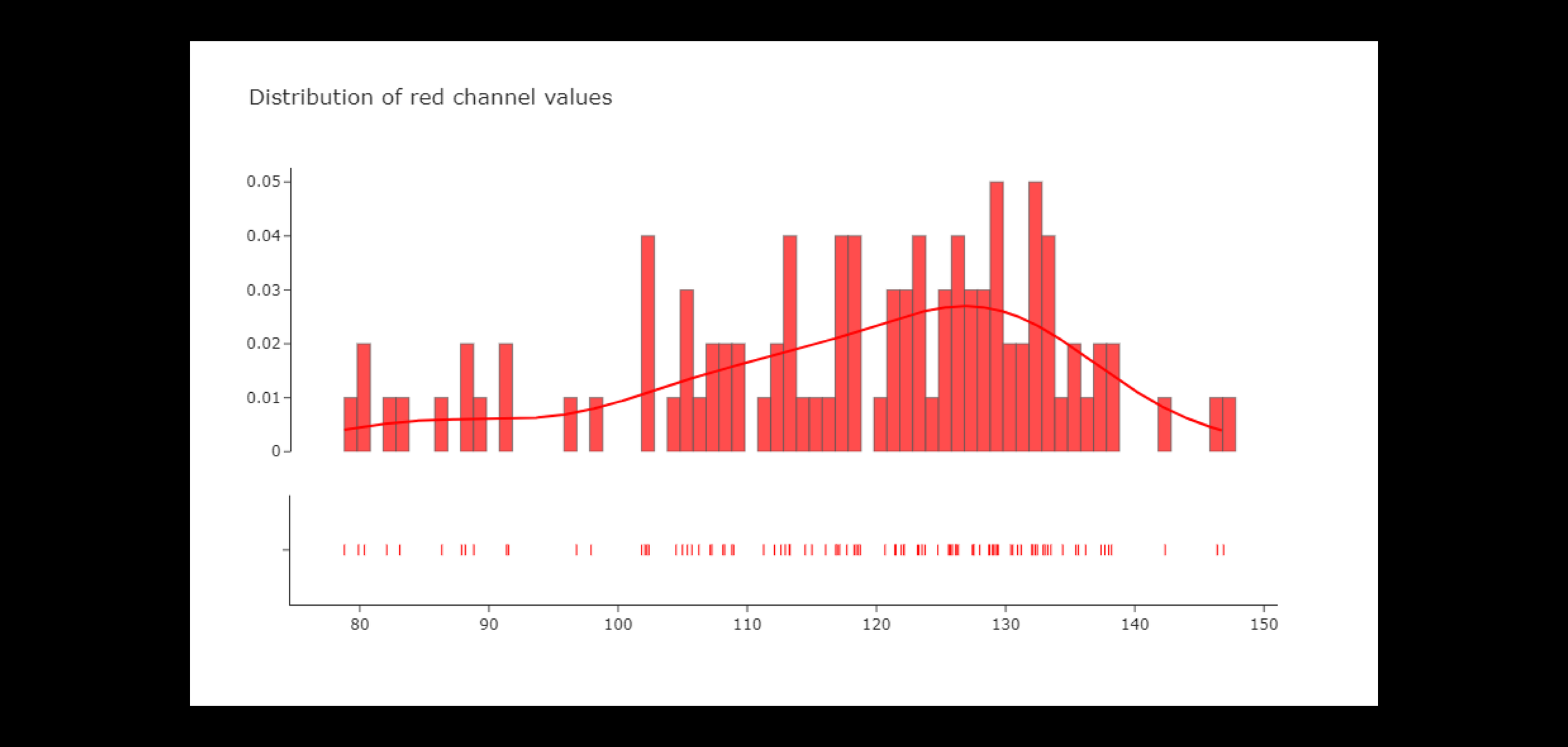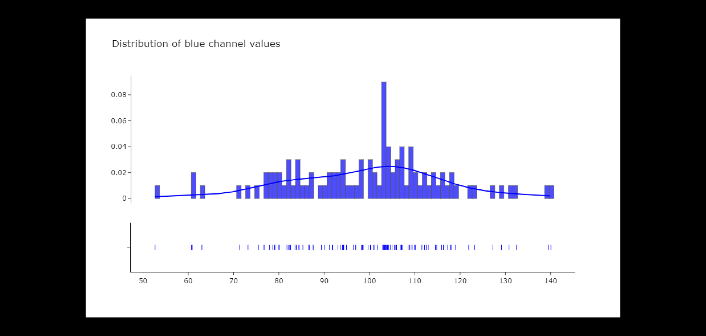 The red channel values seem to roughly normal distribution, but with a slight negative skew. This indicates that the red channel tends to be more concentrated at higher values, at around 100. There is large variation in average red values across images.