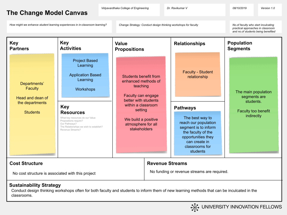 The lean startup concept reciprocates with the business models and establishments. In the context of changing strategies for an enhanced higher education ecosystem, we use lean start-up methodologies to innovate ideas and generate a change model canvas.