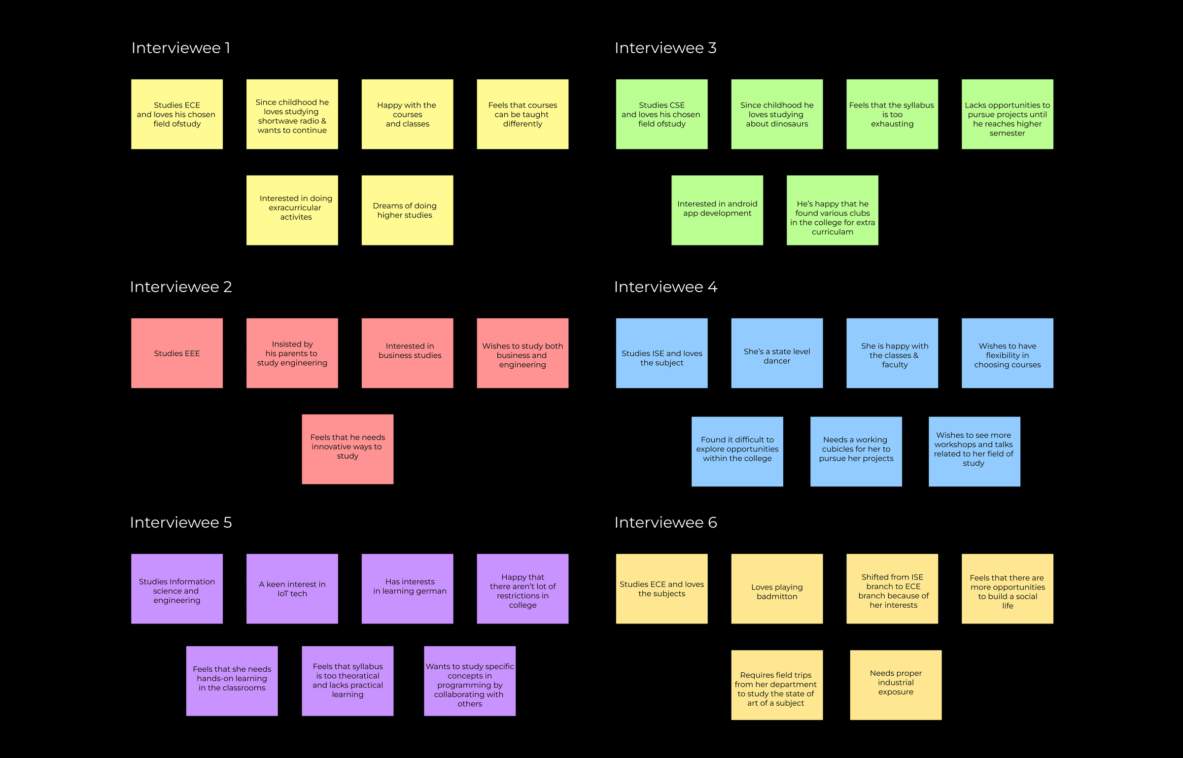 After the interviews, we unloaded the information from the notes in brief points onto digital sticky notes. The below information hides the personal information of the participants.