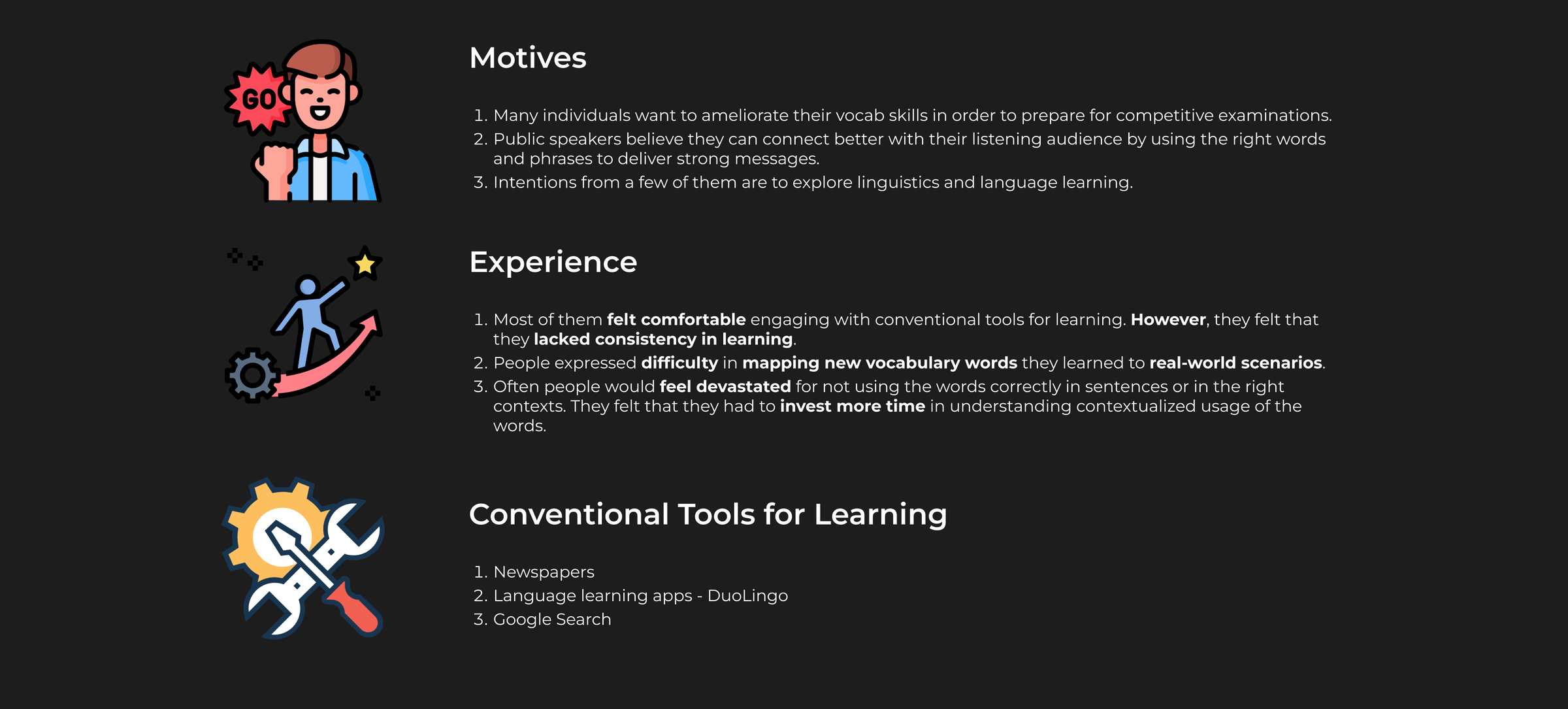 To build a reliable hypothesis for design, it was essential to understand the user's motives to improve their vocabulary skills.