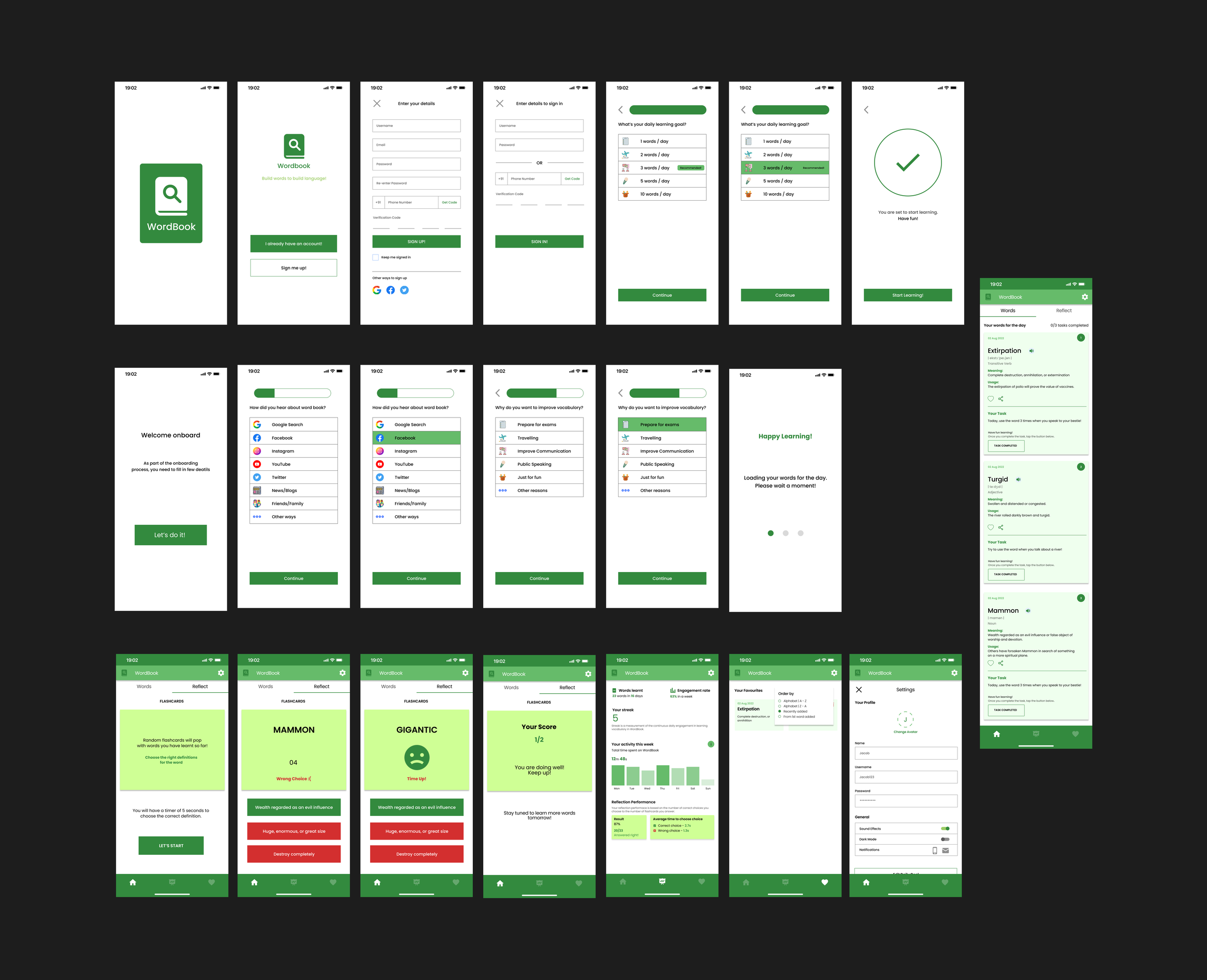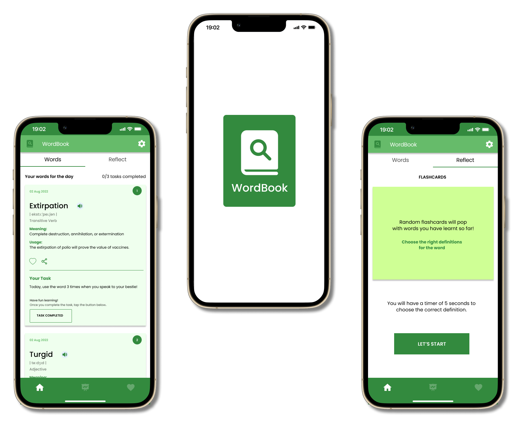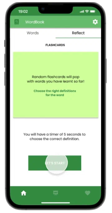 Users learn words and complete tasks in the words screen and move onto the reflecting screen to attempt a short quiz.